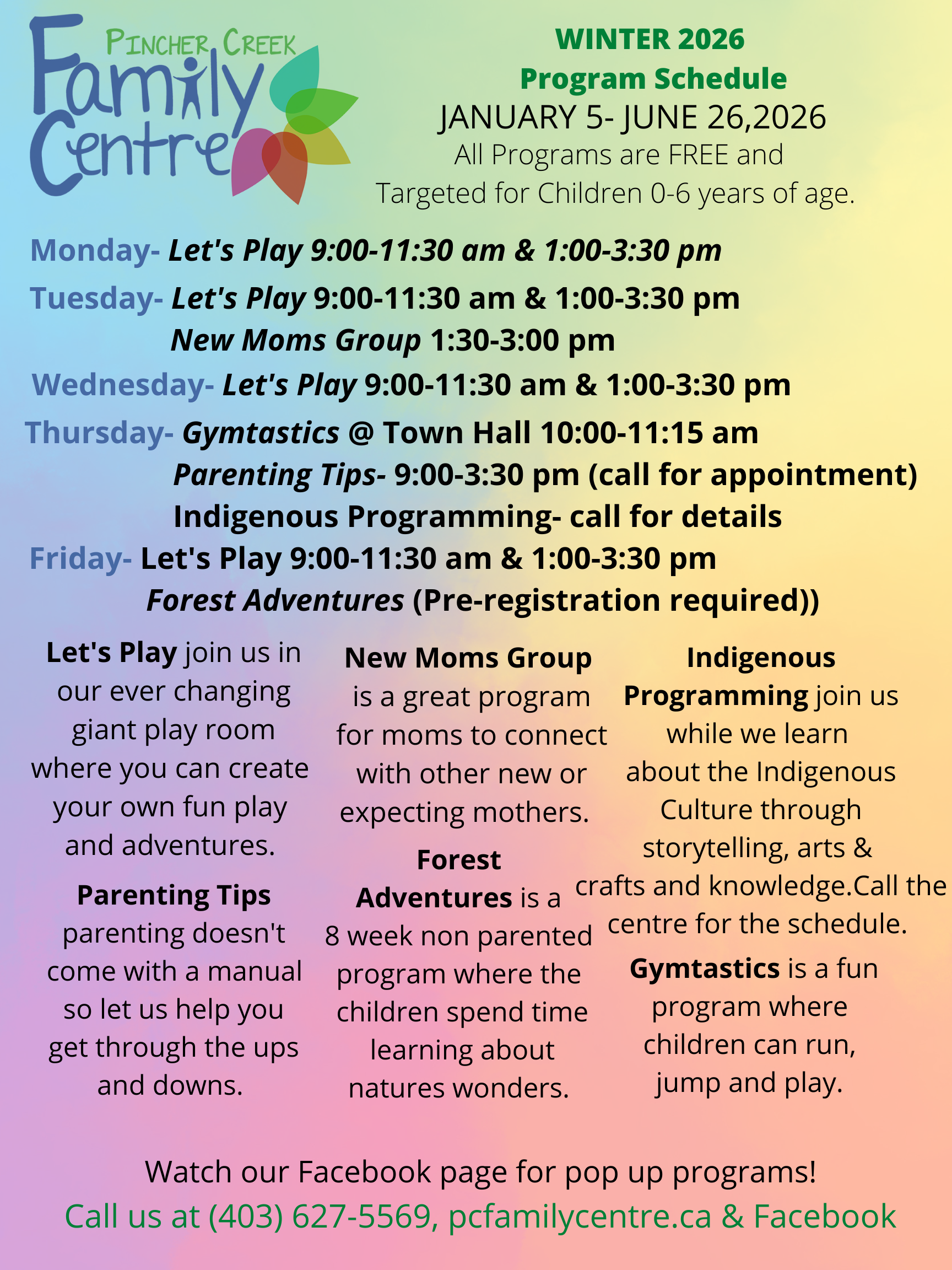 Check out our programming below, or call the centre with questions 403 627 5569 (Closed all Statutory Holidays).